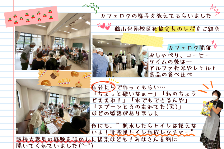 鶴山台南校区にあるいきいきサロン「カフェロク」について、鶴山台南校区社会福祉協議会会長さんから当日の様子とお写真をいただきました🕵️✨