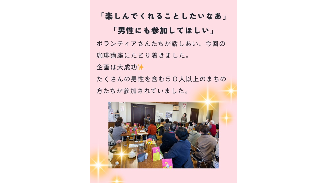 このコーヒー講座は、サロンを運営するボランティアさんたちが、『参加される方が楽しめる企画ないかな?』『男性の参加が少ないから、男性が参加したくなるようなことをしたいなぁ』と話し合われ、校区内にあるカフェに講師を依頼、コーヒーに併せるお菓子は松尾寺町でフランス料理のデリバリをされている方に依頼。町にある社会資源をフル活用で、楽しい講座の開催につながりました。