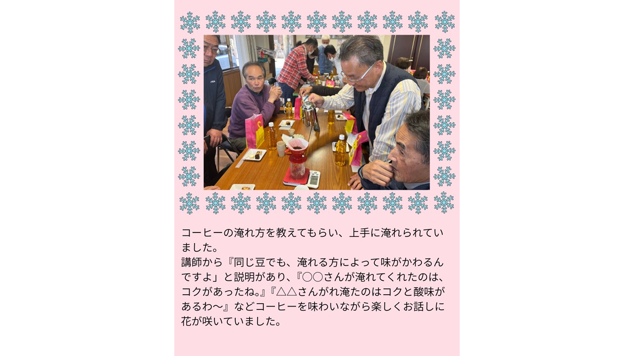11月24日(月)勤労感謝の日の振替休日に、南松尾はつが野校区若樫町いきいきサロンで、“コーヒー講座”が開催されました。