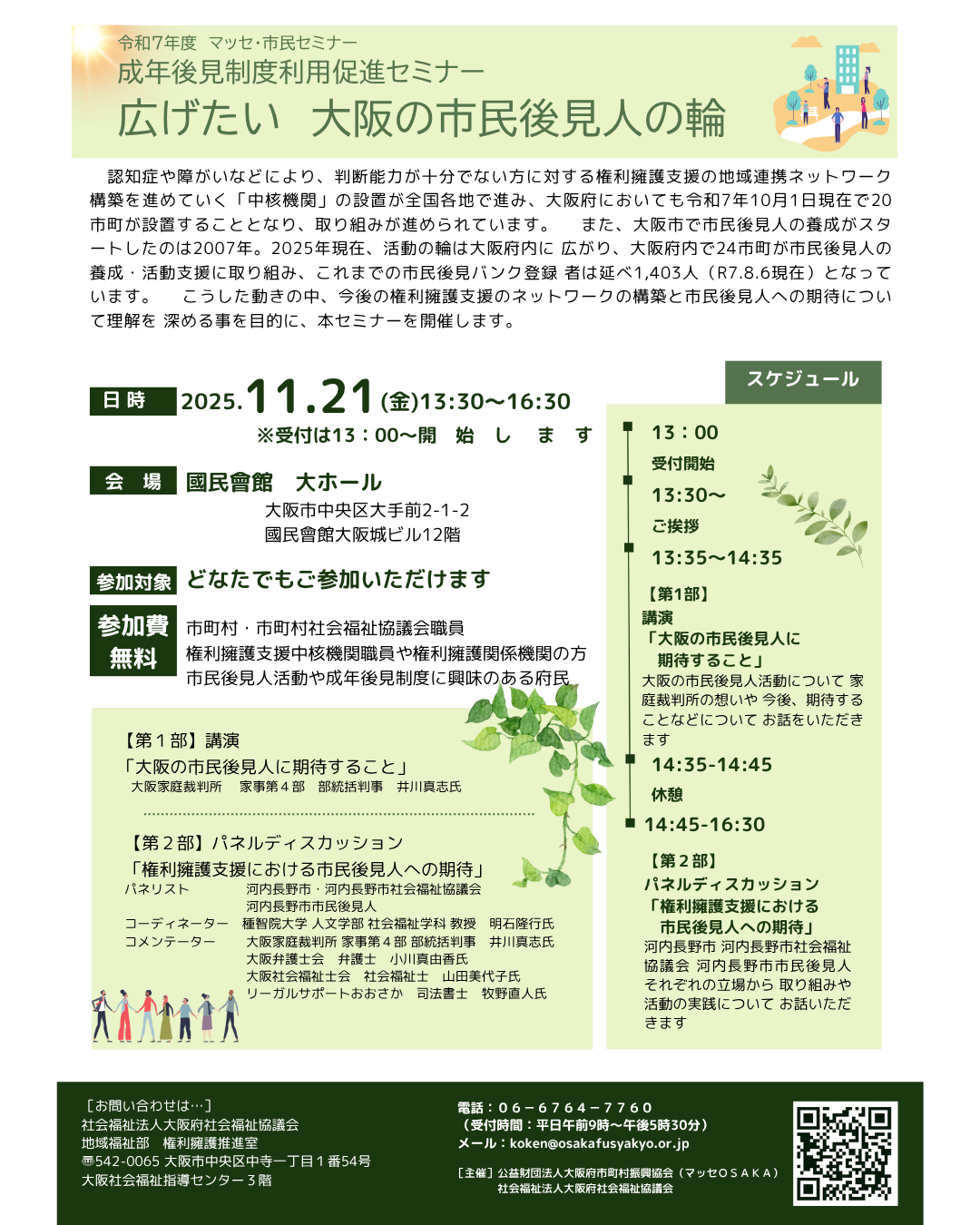 令和7年11月21日(金)に大阪の市民後見人の輪を広げるためのセミナーが開催されます。