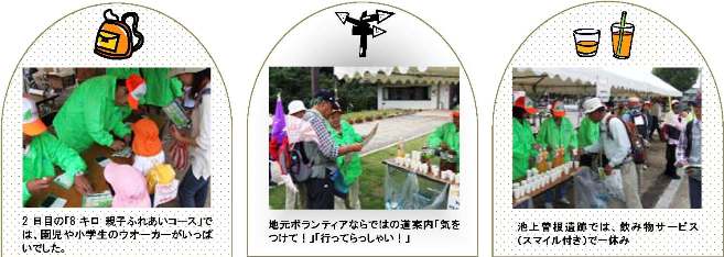 コース上の各チェックポイントでは飲み物のサービスやスタンプ押し、そして地元ボランティアならではの道案内。もちろんスマイル付き!